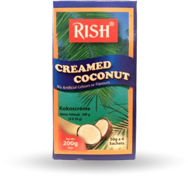 A Rish Creamed Coconut egy praktikus és sokoldalú kókuszdió termék, amely egyedi tasakban kapható. Ez a krémes kókuszdió finomra reszelt kókuszhúsból készül, és gyakran használják a délkelet-ázsiai és más konyhákban, hogy gazdag és krémes kókusz ízt adjon az ételekhez.